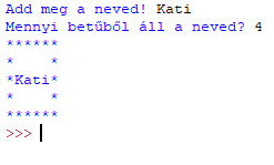 4. Készítsetek programot, amely bekéri a felhasználó nevét, és hogy mennyi betűből áll a név, és kiír egy címkét (csillagokból egy téglalapot alakít ki a név körül).